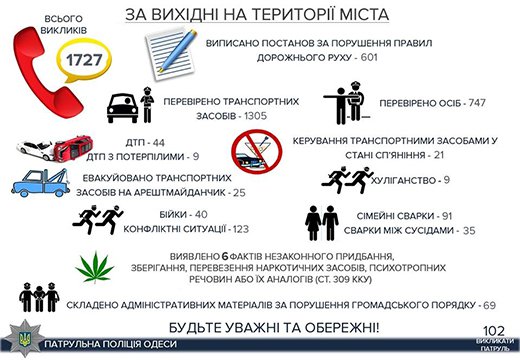 За прошедшие выходные одесситы обращались в полицию 1727 раз. Об этом сообщает пресс-служба патрульной полиции Одессы.В 91 случае полицию вызвали по поводу семейных ссор, еще в 35 — в связи со скандалами с соседями.В городе было зарегистрировано 123 конфликтные ситуации, 40 драк, 9 случаев хулиганства. ... >>